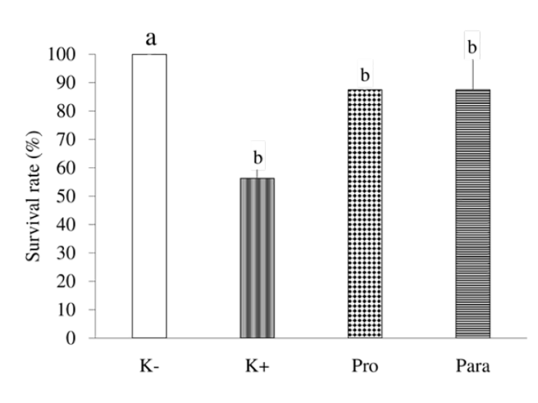 Biểu đồ thể hiện tỷ lệ sống của cá diêu hồng với 1 nhóm không thử thách với vi khuẩn gây bệnh (K-), 3 nhóm được tiêm S. agalactiae gây bệnh: Pro (nhóm cá 1 đã được bổ sung 1% probiotic), Para (nhóm cá 2 đã được bổ sung 1% paraprobiotic) và K+ nhóm đối chứng không bổ sung.