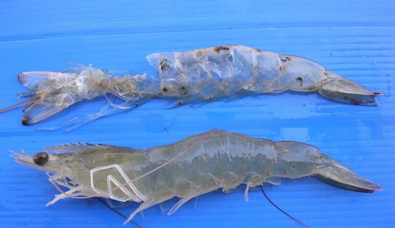 Đàn tôm nuôi còn bị kích thích lột xác “bất đắc dĩ”, tuy nhiên vì đột ngột và mới mưa xuống nên sẽ không đủ khoáng chất cung cấp cho quá trình lột xác làm tôm rất yếu và dễ nhiễm một số mầm bệnh khác.