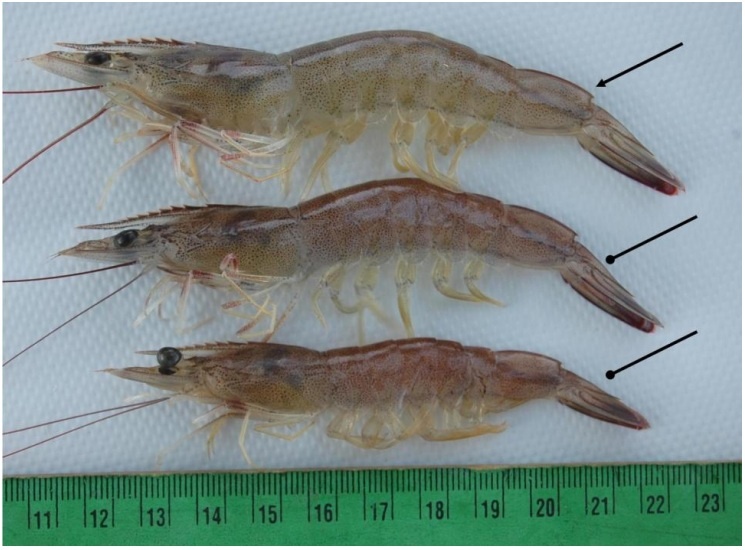 Tôm biểu thị sự căng thẳng có sắc tố cao hơn và nguyên nhân gây ra bởi sự biến động của thông số môi trường trong ao nuôi tôm. Tôm trên bình thường, tôm dưới tôm bệnh. Ảnh: Naresh Kumar Dewangan và Ayyaru Gopalakrishnan 2016