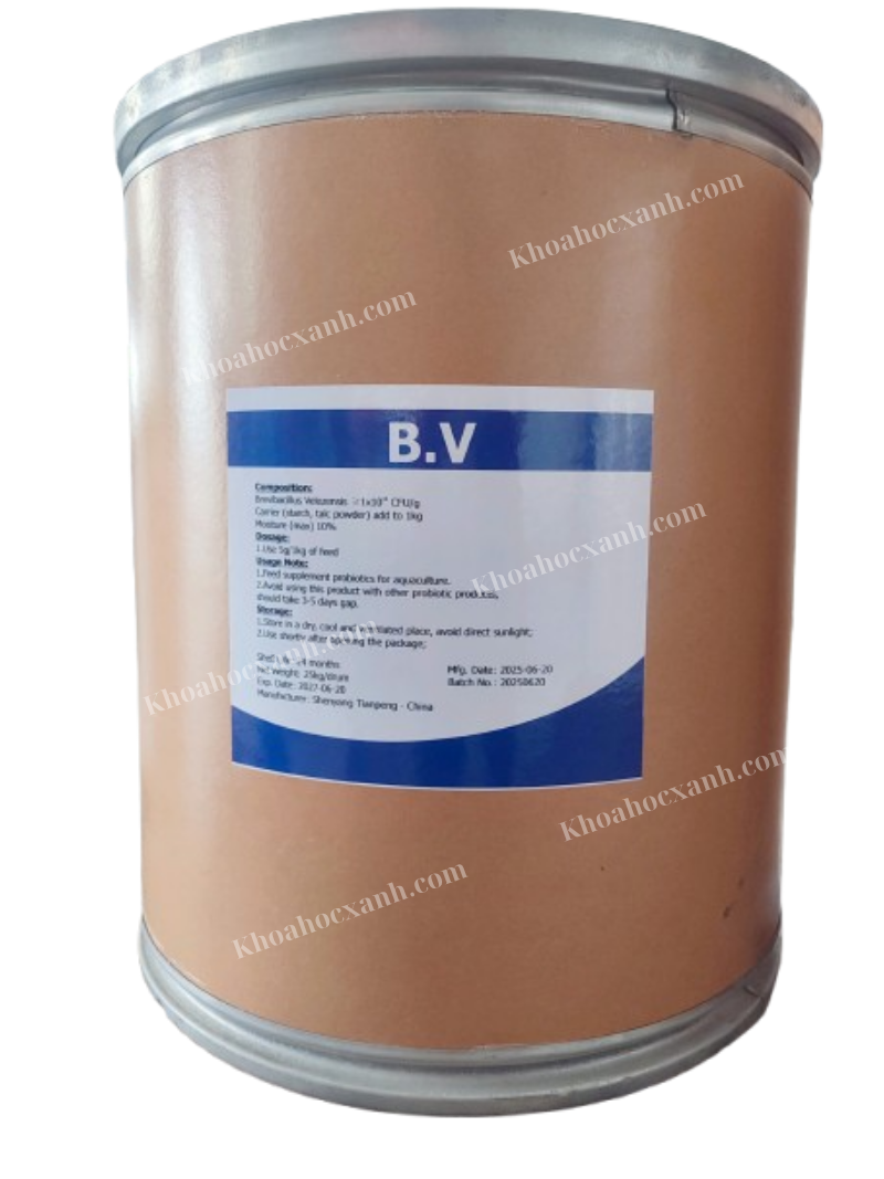 -Xử lý nước: : Đầu vụ nuôi 100- 200g/ 5.000m3, giữa và cuối vụ nuôi nên tăng liều 300- 500g/ 5.000m3. Tốt nhất nên sinh khối trước khi sử dụng với công thức 100g B.V + 500g mật rỉ đường + 5 lít nước sạch, ủ trong 4 -6 tiếng rồi đem tạt đều khắp ao.