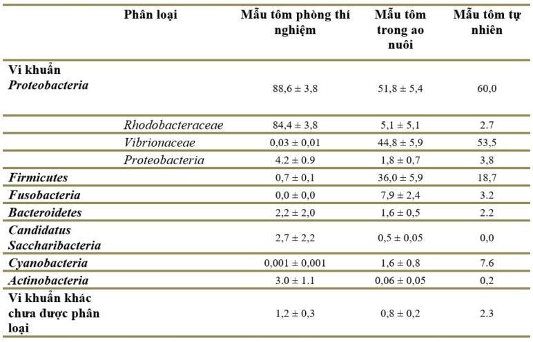 Qua 699.259 lượt đọc và phân tích kết quả thí nghiệm các mẫu ruột tôm ở 3 môi trường sống cho thấy sự khác biệt lớn về số lượng vi sinh vật ở 3 môi trường. Trong đó chủng vi khuẩn được nuôi trong phòng thí nghiệm chiếm ưu thế hơn các môi trường còn lại như Proteobacteria, Bacteroidetes, Saccharibacteria và vi khuẩn Actinobacteria. Nhưng riêng vi khuẩn Vibrionaceae, Firmicutes, Fusobacteria và khuẩn lam được tìm thấy nhiều nhất ở mẫu tôm ao nuôi.